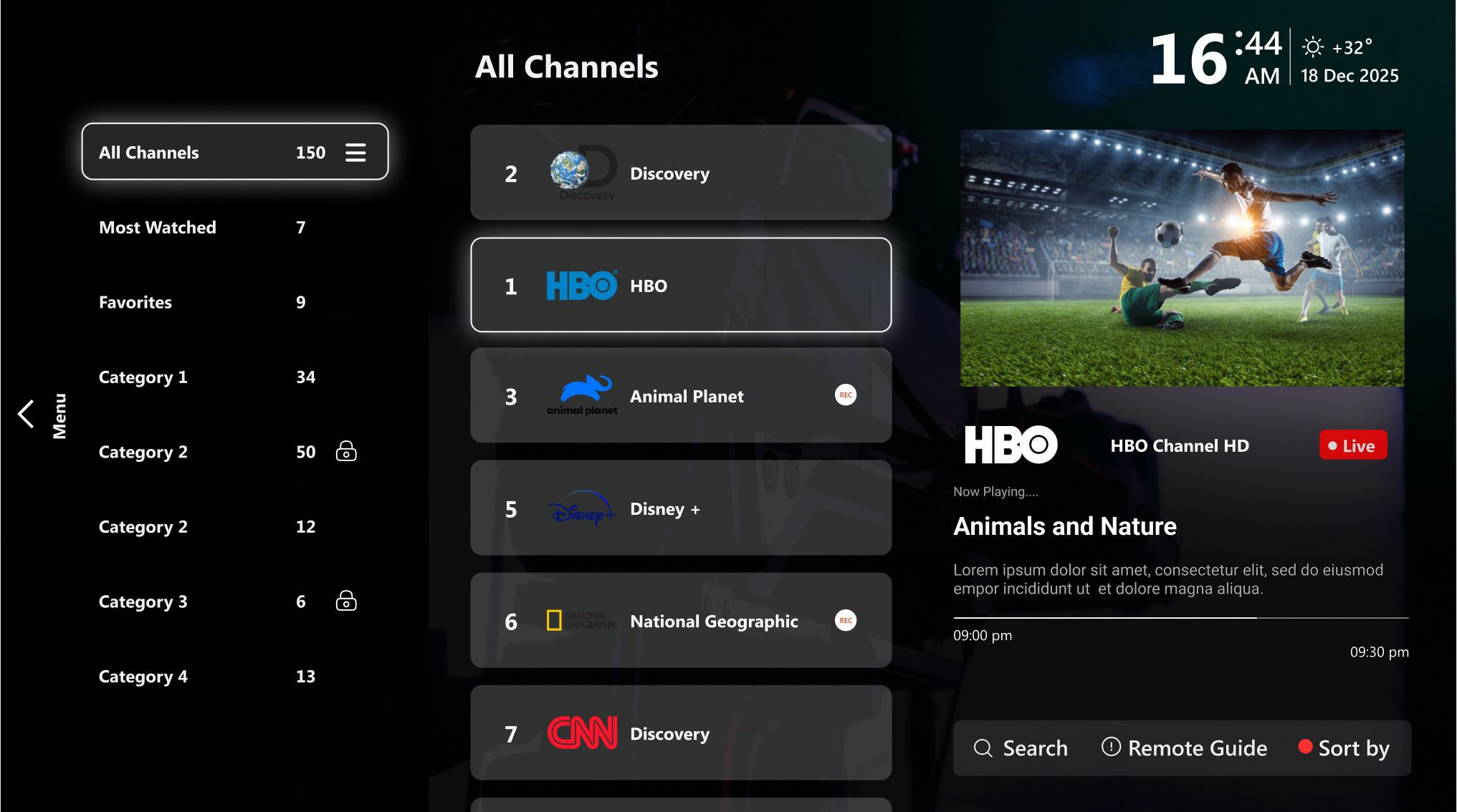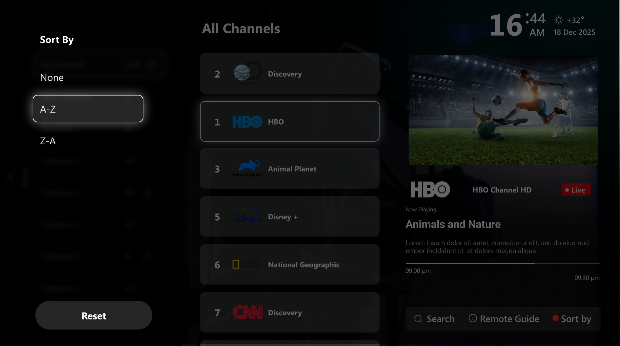 Click on red button your remote, You can sort channels by Name — A–Z or Z–A.